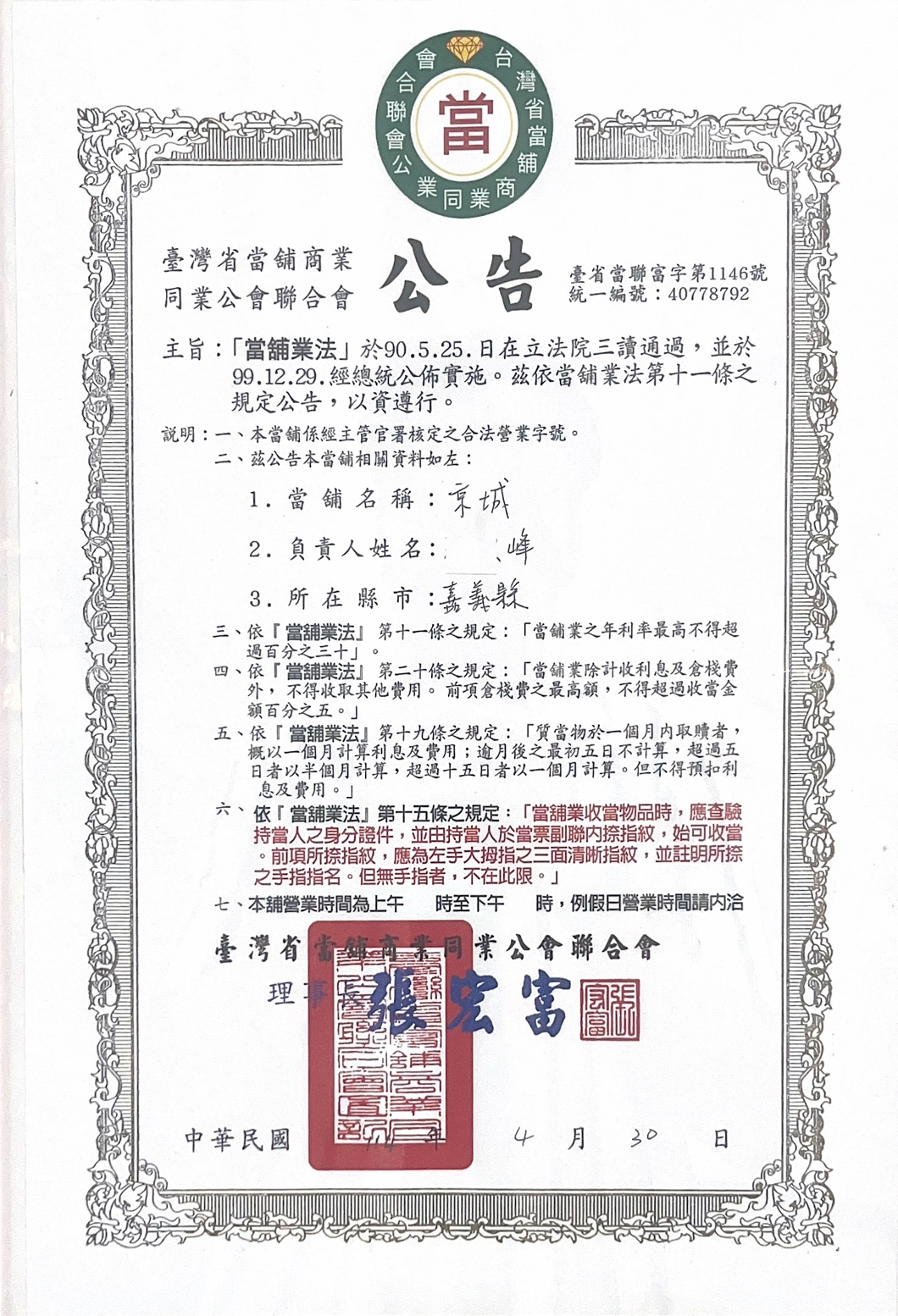 營業執照: 店內應懸掛由當地警察局核發的「當舖業許可證」。